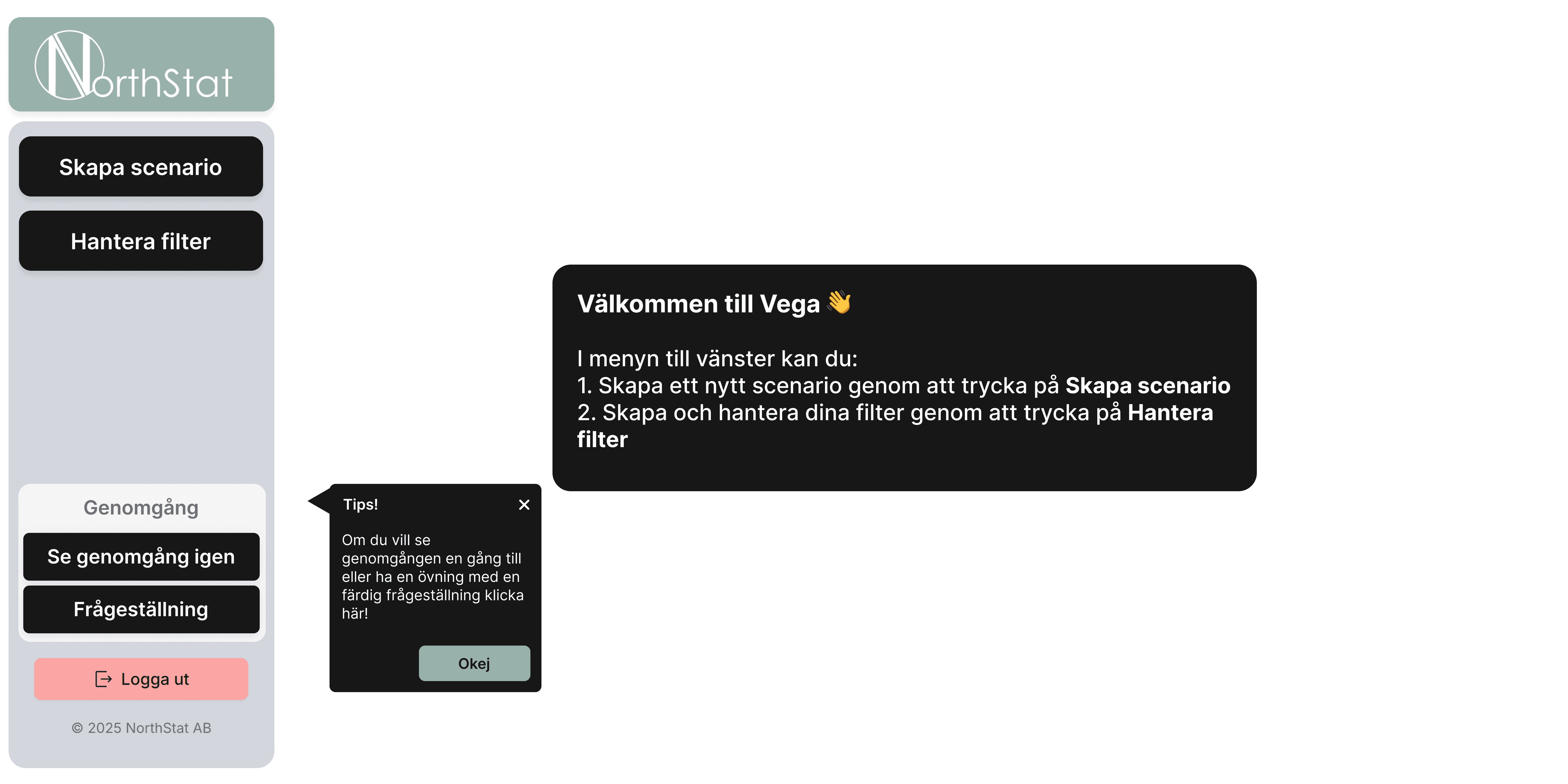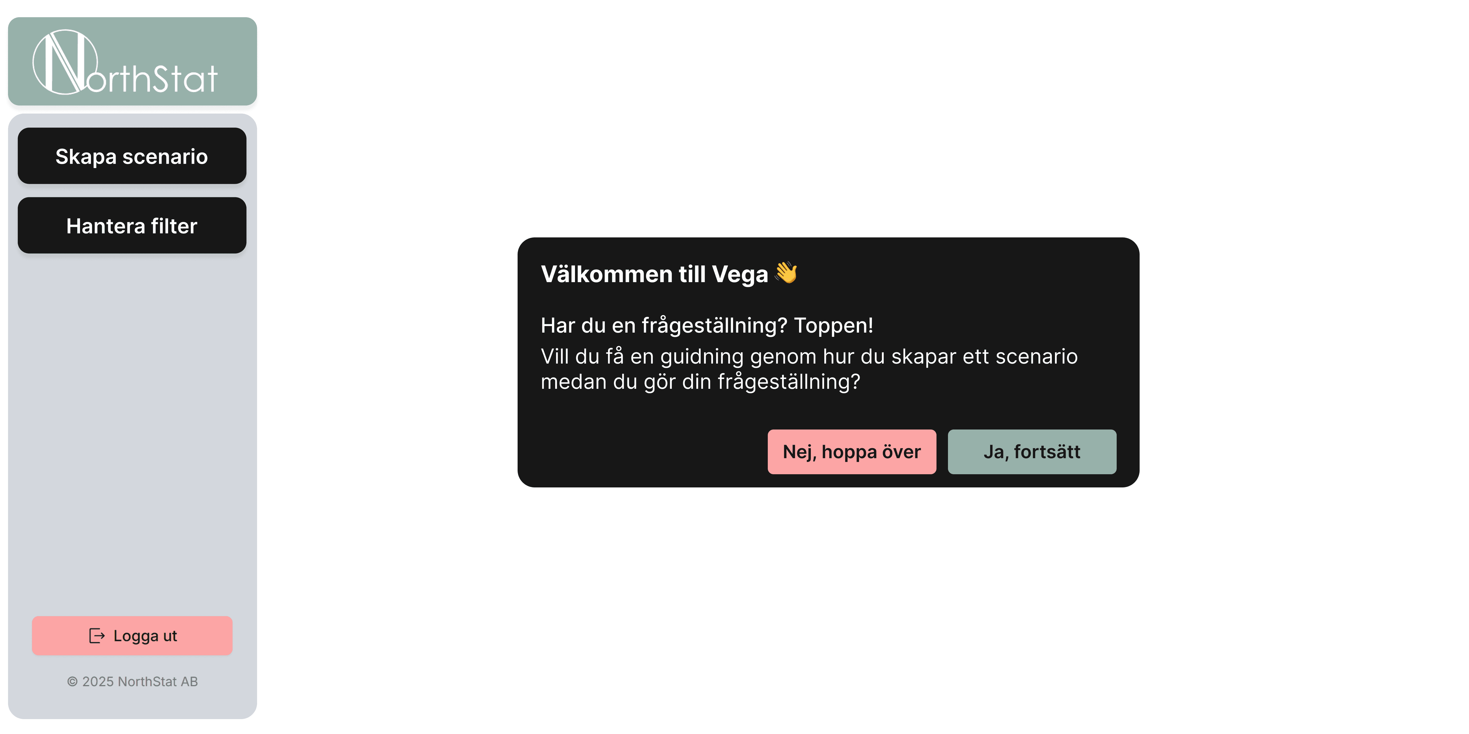 The onboarding experience begins with a welcome screen where users are introduced to Vega’s onboarding feature. From this screen, users can choose whether they want to start the onboarding walkthrough or skip it and explore the platform independently. This gives users flexibility and allows more experienced users to skip the introduction if they prefer.