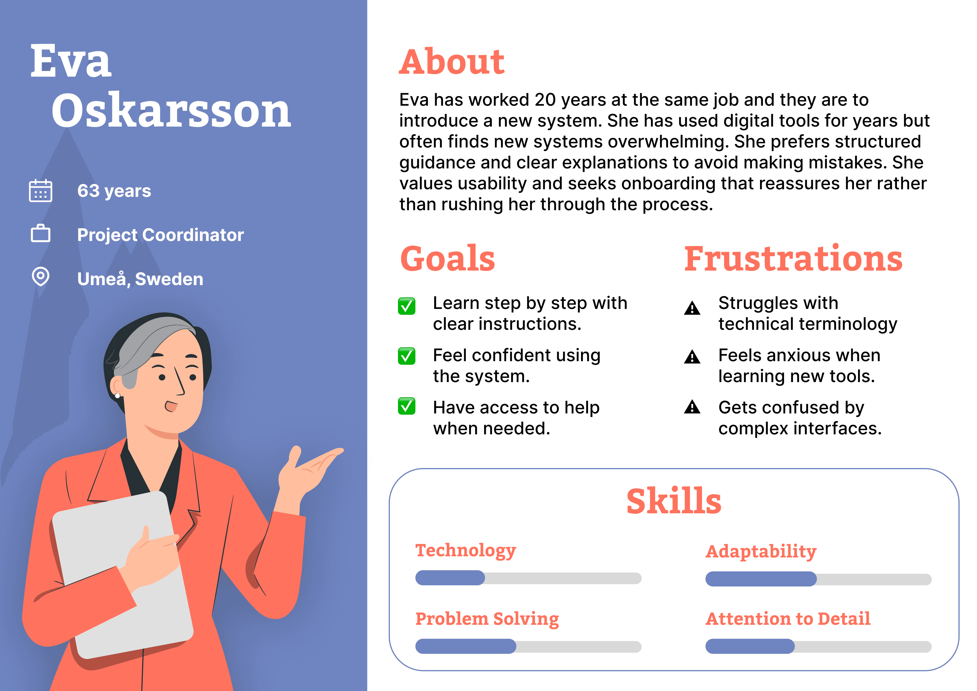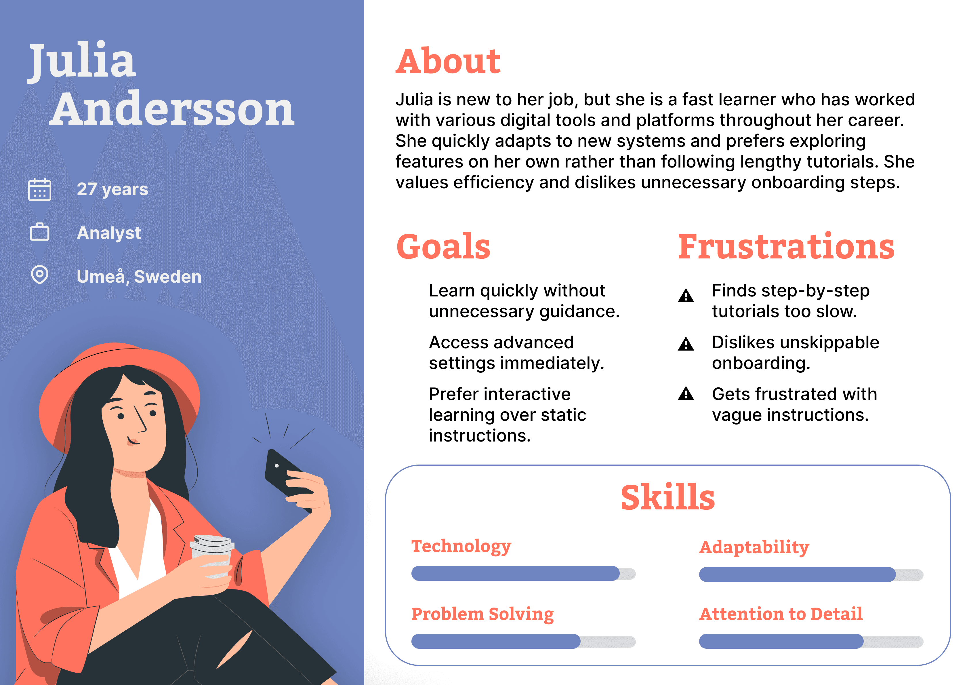 Two personas were created to represent different types of Vega users. Julia represents tech-savvy users who are comfortable with digital tools and prefer learning systems quickly through exploration. She values efficiency and dislikes long tutorials. Eva represents users who have experience with digital tools but can feel overwhelmed when learning complex systems. She prefers structured guidance and clear explanations that help her avoid mistakes. These personas helped ensure that the onboarding design supported both experienced and less experienced users.