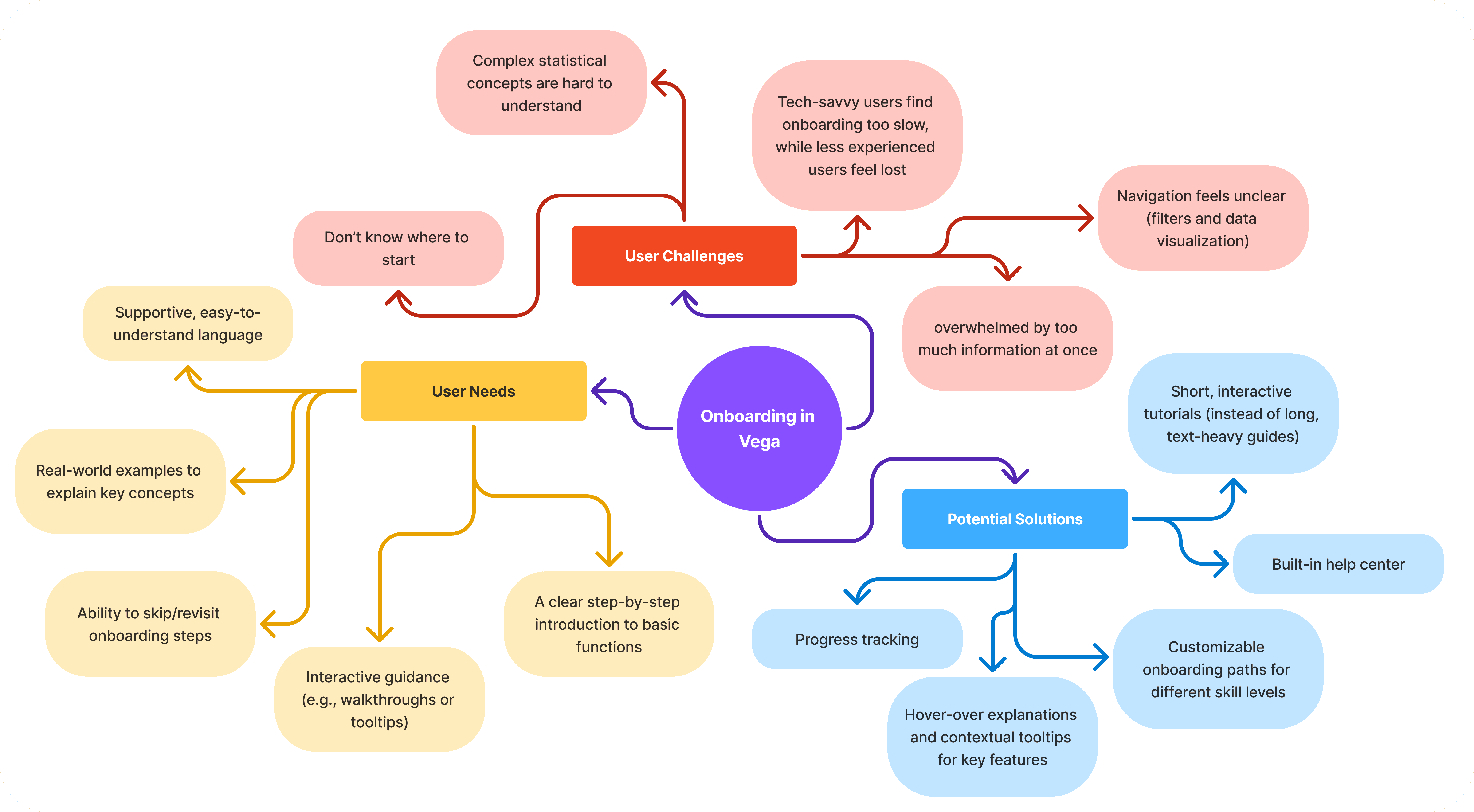 To organize the insights gathered from interviews and the heuristic evaluation, a mind map was created. The goal was to structure the key themes that emerged during the research phase and identify patterns in users’ challenges and needs. The mind map helped group insights related to navigation difficulties, complex statistical concepts, and the need for clearer guidance when interacting with the system. It also highlighted the differences between experienced and less experienced users and how their needs vary when learning a complex analytical tool. These insights helped define the main design opportunities and guided the development of the onboarding concepts.